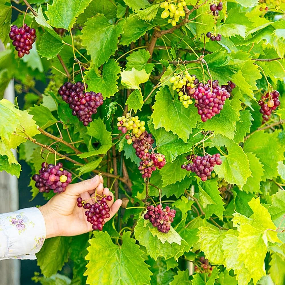 RazzMatazz is a grape-growing breakthrough. Backed by more than 20-years of research and testing, it’s the first seedless grape to grow successfully without any spraying. RazzMatazz was cultivated to combine the flavor and texture of table grapes with the disease resistance and native hardiness of muscadines. It’s a seedless grape, but also a continually-fruiting variety, which means it will set blooms and yield grapes from midsummer to first frost. Fruit size is similar to champagne grapes and can be picked in bunches making harvest easy. The fruit simply glows in the sunshine, creating a stunning display. RazzMatazz produces tiny gems bursting with sweet, refreshing flavor. If growing on an arbor or fence give each vine about 15 ft. of growing space. When growing in patio containers or hanging baskets which is a wonderful way to grow Razzmatazz, less space is needed as individual shoots will typically only grow 6 ft. or so. This variety is protected under the following U.S. Patents: U.S. Utility Patent No. 9,045,767 and U.S. Plant Patent No. PP31,010. Unauthorized use and propagation is prohibited.