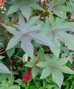 Castor Bean plants will provide you with a fast-growing privacy screen. This non-food bean plant grows 10 ft. to 12 ft. tall and has gigantic leaves. The leaves, which may be green, red, bluish-gray, maroon, purple or variegated, are veined with scarlet and measure 3 ft. across. These plants love heat and moisture. Sow the seeds directly in the ground after last frost or start indoors 6-weeks to 8-weeks before the last frost.
