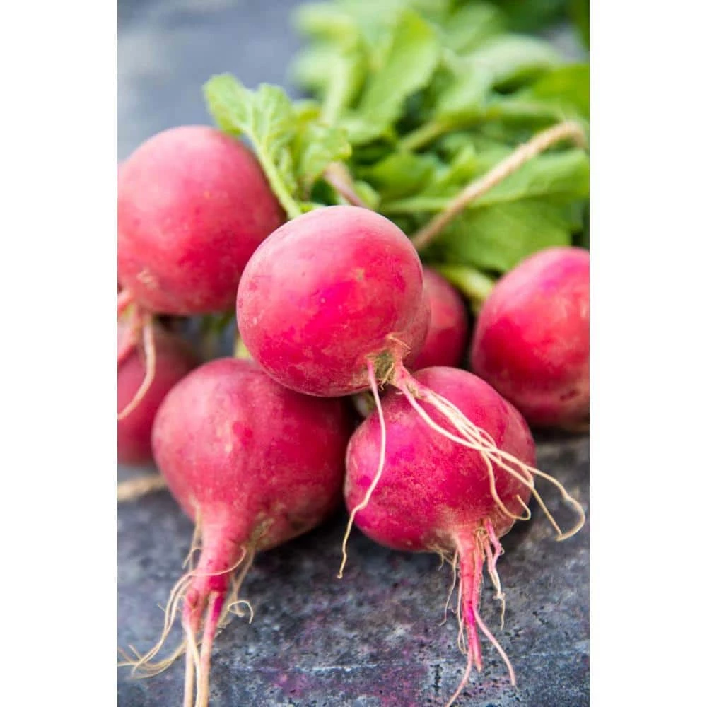 Cherry Belle Radish is a cherry-sized, uniform variety with crimson skin and mild white flesh with just a little bite. It’s crisp, firm, and a good variety for bunching. It won’t get pithy, either. No wonder it’s a classic favorite.