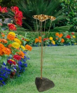 - A unique garden sculpture with brass bells that resemble flowers growing from within a faux rock