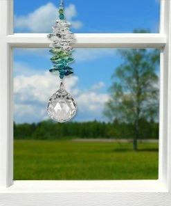Our Crystal Grand Cascade – Green features a cascade of crystals that mimics the morning sky. Lighter color crystals lead down to darker ones and are finished with a faceted genuine Austrian crystal ball. Not boxed, instead it comes with a sheer organza gift bag. Recommended for indoor use. This product is handcrafted with pride in the U.K., therefore sizes can vary. Woodstock Rainbow Makers do for light what our chimes do for sound.